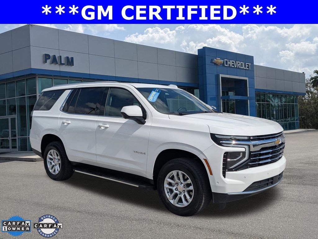Certified. This 2025 Chevrolet Tahoe LT in Summit White features: 4WD ONE OWNER, Tahoe LT, 4D Sport Utility, EcoTec3 5.3L V8, 10-Speed Automatic with Overdrive, 4WD, Summit White, Jet Black Leather, 1st and 2nd Row Color-Keyed Carpeted Floor Mats, 3-Spoke Wrapped Steering Wheel, 3rd Row Manual 60/40 Split-Folding Bench Seats, 6-Speaker Audio System Feature, 8-Way Power Driver Seat Adjuster, 8-Way Power Front Passenger Seat Adjuster, Color-Keyed Carpeting Floor Covering, Floor Console with Storage Area, Front Bucket Seats, Front Pedestrian and Bicyclist Braking, Frontal Driver and Outboard Passenger Airbags, Memory seat, Memory Settings For Driver, Preferred Equipment Group 1LT, Radio: 17.7" Diagonal Advanced Color LCD Display, Rear Power Liftgate, Remote keyless entry, Remote Start, SiriusXM with 360L Trial Subscription, USB Ports, Wheels: 18" x 8.5" Bright Silver Painted Aluminum, Wireless Phone Charging. CARFAX One-Owner.