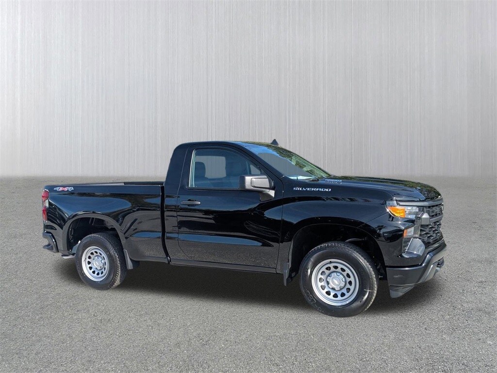Silverado 1500 WT, 2D Standard Cab, 2.7L I4 Turbocharged DOHC 16V LEV3-SULEV30 310hp, 8-Speed Automatic, 4WD, Black, Jet Black Vinyl, 3.5" Monochromatic Display Driver Info Center, 4-Way Manual Driver Seat Adjuster, Black (Semi-Gloss) Front Bumper, Black (Semi-Gloss) Rear Bumper, Bluetooth® For Phone, Electronic Cruise Control, Front Frame-Mounted Black Recovery Hooks, HD Rear Vision Camera, Heated Power-Adjustable Outside Mirrors, Locking Tailgate, Manual Tilt Wheel Steering Column, OnStar Services Capable, Preferred Equipment Group 1WT, Remote Keyless Entry, Rubberized-Vinyl Floor Covering, SiriusXM Delete, Solar Absorbing Tinted Glass, Standard Tailgate, Teen Driver, Tire Pressure Monitoring System, Wi-Fi Hot Spot Capable. 4WD