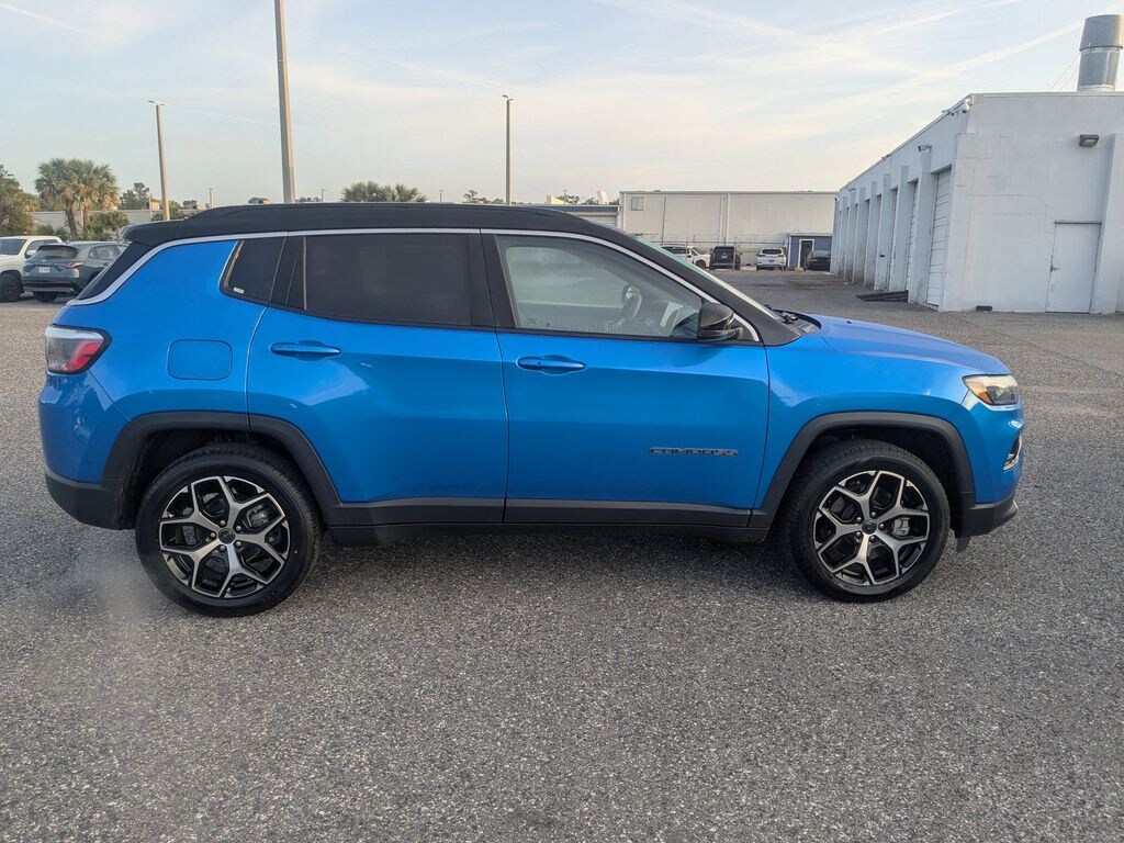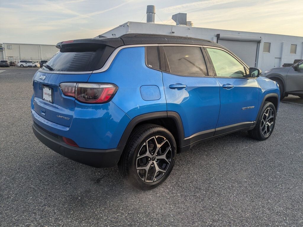 Hydro Blue Pearlcoat 2025 Jeep Compass Limited Limited 2.0L I4 DOHC 4WD 8-Speed Automatic 4WD, 10.1" Touchscreen Display, 3.73 Final Drive Ratio, 4-Wheel Disc Brakes, 6 Speakers, ABS brakes, Air Conditioning, Alloy wheels, AM/FM radio: SiriusXM, Apple CarPlay/Android Auto, Auto High-beam Headlights, Auto-dimming Rear-View mirror, Automatic temperature control, Brake assist, Bumpers: body-color, Compass, Delay-off headlights, Driver door bin, Driver vanity mirror, Dual front impact airbags, Dual front side impact airbags, Electronic Stability Control, Emergency communication system: Jeep Connect, Four wheel independent suspension, Front anti-roll bar, Front Bucket Seats, Front Center Armrest w/Storage, Front dual zone A/C, Front fog lights, Front License Plate Bracket, Front reading lights, Fully automatic headlights, Heated door mirrors, Heated front seats, Illuminated entry, Knee airbag, Leather Shift Knob, Leather steering wheel, Leatherette Seats, Low tire pressure warning, Occupant sensing airbag, Outside temperature display, Overhead airbag, Overhead console, Panic alarm, ParkView Rear Back-Up Camera, Passenger door bin, Passenger vanity mirror, Power door mirrors, Power driver seat, Power steering, Power windows, Premium audio system: UConnect 5, Quick Order Package 29G, Radio: Uconnect 5 w/10.1" Display, Rain sensing wipers, Rear anti-roll bar, Rear seat center armrest, Rear window defroster, Rear window wiper, Remote keyless entry, Security system, Speed control, Split folding rear seat, Spoiler, Steering wheel mounted audio controls, Tachometer, Telescoping steering wheel, Tilt steering wheel, Traction control, Trip computer, Turn signal indicator mirrors, Variably intermittent wipers, Wheels: 18" x 7" Painted Diamond Cut Alum (DISC), 4WD.