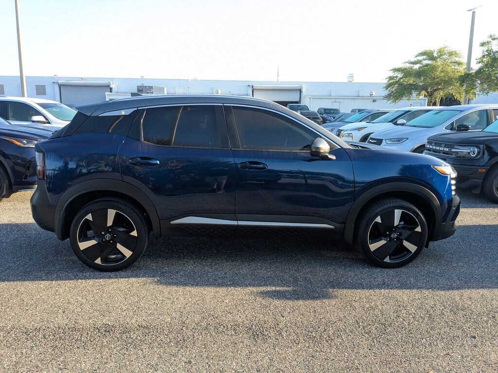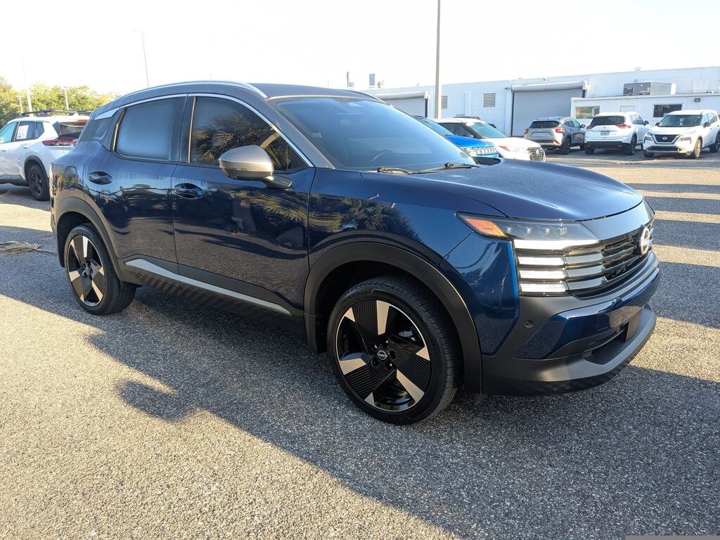 Deep Blue Pearl 2025 Nissan Kicks SR SR 2.0L DOHC FWD CVT with Xtronic 17" Alloy Wheels, 19" Alloy Wheels, 2-Tone Premium Paint, 4-Wheel Disc Brakes, 6 Speakers, ABS brakes, Air Conditioning, Alloy wheels, AM/FM radio: Sirius, Auto High-beam Headlights, Automatic temperature control, Brake assist, Bumpers: body-color, Carpeted Floor Mats & Underfloor Protector, Delay-off headlights, Driver door bin, Driver vanity mirror, Dual front impact airbags, Dual front side impact airbags, Electronic Stability Control, Front anti-roll bar, Front Bucket Seats, Front Center Armrest, Front reading lights, Front wheel independent suspension, Fully automatic headlights, Illuminated entry, Knee airbag, Leather Shift Knob, Leather steering wheel, Low tire pressure warning, Occupant sensing airbag, Outside temperature display, Overhead airbag, Overhead console, Panic alarm, Passenger door bin, Passenger vanity mirror, Power door mirrors, Power steering, Power windows, Radio data system, Radio: AM/FM Audio System, Rear anti-roll bar, Rear reading lights, Rear seat center armrest, Rear side impact airbag, Rear window defroster, Rear window wiper, Remote keyless entry, Security system, Speed control, Speed-sensing steering, Splash Guards, Split folding rear seat, Spoiler, Sport Cloth/Leatherette Seat Trim, Sport steering wheel, Steering wheel mounted audio controls, Tachometer, Telescoping steering wheel, Tilt steering wheel, Traction control, Trip computer, Turn signal indicator mirrors, Variably intermittent wipers, Wireless Apple CarPlay/Wireless Android Auto.